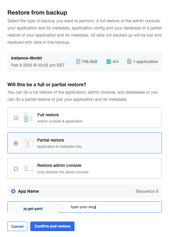 Only full backups can be restored using the KOTS CLI. To restore an application from a partial backup, use the Admin Console. See Restore the Application Only Using the Admin Console.