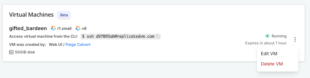 replicated vm create --distribution ubuntu --network accbd6a7.Example output: